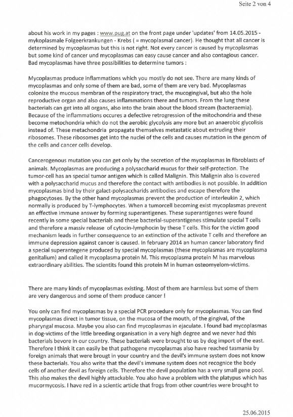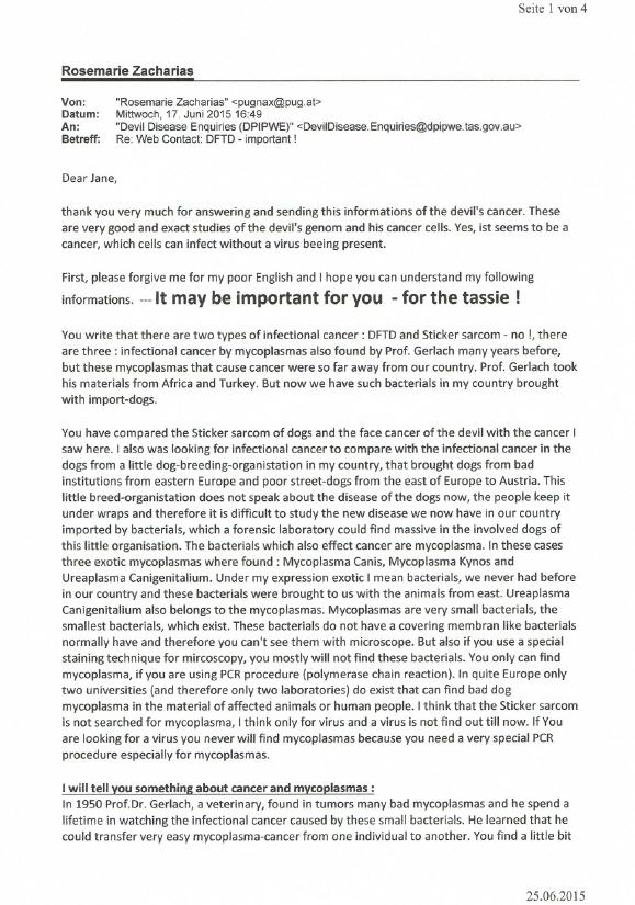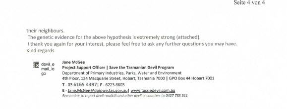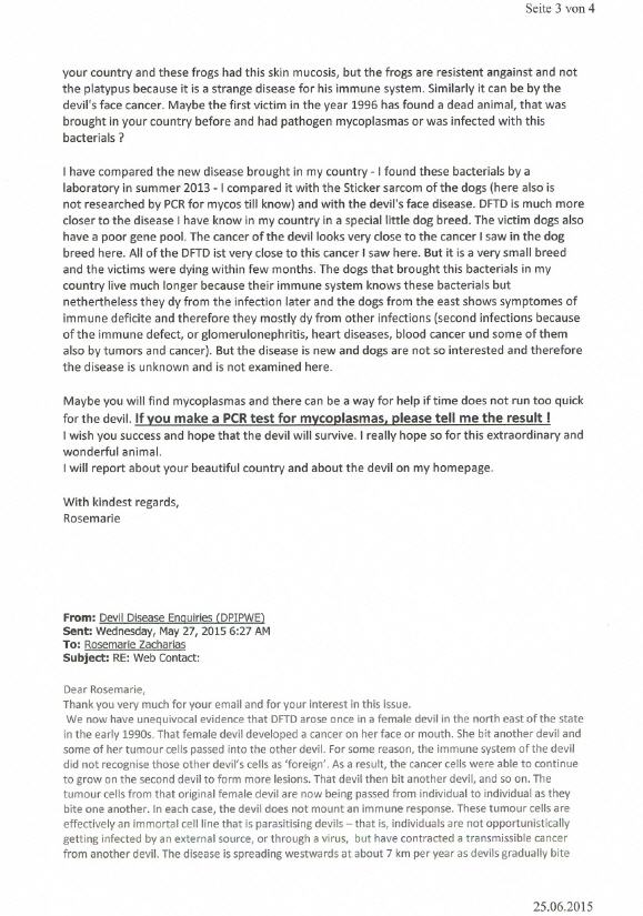 Die tasmanische Forschungseinrichtung bezüglich des Teufels DFTD hat mir die Studien über das Genom des Teufels und das seiner Krebszellen übermittelt. Eine äußerst interessante Studie einer, wenn ich so sagen darf, parasitären Krebsform, die bisher nur beim tasmanischen Teufel anzutreffen ist, was auf sein sehr kleines Genom mit großer Wahrscheinlichkeit zurückzuführen ist. Für die Einsicht in die Studien der hervorragenden, genetischen Arbeiten am Genom des Tasmanischen Teufels und der Krebszellen bin ich der tasmanischen Forschungsgesellschaft sehr dankbar und zog Vergleiche mit dem mykoplasmalen Karzinomen eines Hundeklubs meines Landes und mit dem Stickersarkom. Eine Gemeinsamkeit ergibt sich jedoch in manchen Fällen nur äußerlich, ansonst handelt es sich beim DFTD um eine vollkommen eigenständige Krebserkrankung des Teufels.
