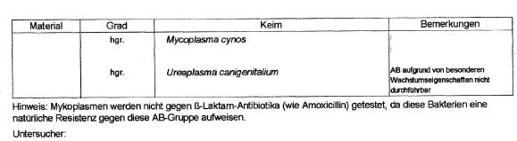 In der ausführlichen Dokumentation über MYKOPLASMOSE - Mops wurde bereits ein anderer bakteriologischer Prüfbericht, am Ende des gesamten Kapitels zur Orientierung einer gesunden Flora mittels einer Untersuchung, welche ein Jahr zuvor durchgeführt wurde, des selben Rüden ausgewiesen.