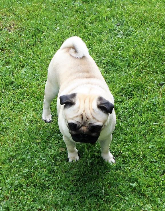 Quid - Mai 2020 - 7 Jahre jung; das obige Bild zeigt Quid's Kopf im Alter von 2 Jahren - hier im Alter von 7 Jahren. Die Augen des Rüden sind, nach wie vor, vollkommen gesund, glänzend, schwarz, wie Ebenholz, ohne jegliche Flecken oder Trübung. Die Nasenlöcher vollkommen offen, die Atemwege frei und zeigt der Mops aus sorgfältiger Zucht lebenslang optimale Gesundheit in allen Bereichen. Quid illustriert das perfekte Rosenohr dieser Rasse. Beim Mops sind die Ohren lt. Rassestandard GB klein, in Form des perfekten Knopf- oder Rosenohr. Hier sind beide Ohrenformen erwünscht. Die untere Spitze der Ohren bildet mit der Pupille der Augen eine gerade Linie und darf diese von den winzigen Öhrchen nicht überschritten werden. Der Kopf ist rund mit massiven Kiederknochen und 42 Zähne, deren Wurzeln tievf im Kieder verankert sind. Quid hat mit 7 alle 42 Zähne, weiß und gesund. Ein wunderbarer Rüde mit besonderen Eigenschaften. |