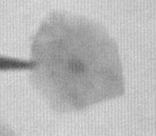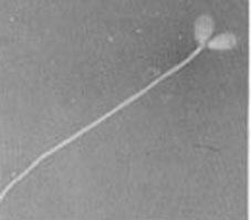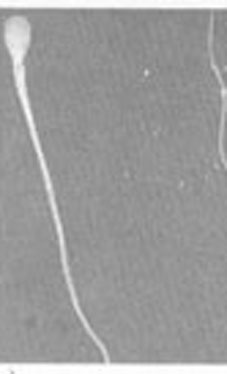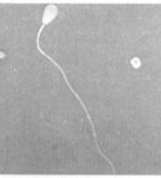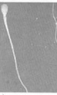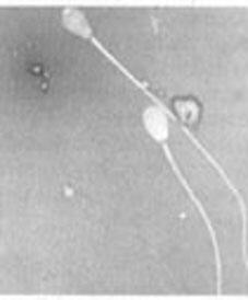 rechts im Bild befindet sich ein Spermium, dessen Mittelstück mißgebildet ist. Die beiden Spermien links davon zeigen doppelte Mittelstücke. Alle diese Spermien sind nicht befruchtungsfähig