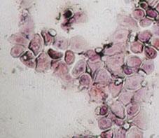 In diesem Bild sind Superfizialzellen = Schollen und am Rande des Cluster Intermediärzellen zu erkennen. Der Hintergrund dieses vaginalzytologischen Abstriches ist absolut sauber - ein gesunder Abstrich.