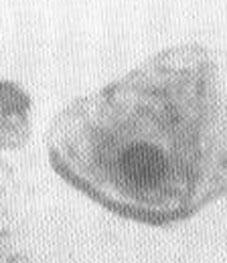 links im Bild erkennt man eine parabasale Zelle, rechts bereits die typische intermediäre Zelle des im späten Proöstrus, bzw. frühen Östrus befindlichen, vaginalen Epitheles.