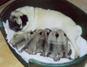 Links im Vordergrund : Canis Pugnax Ophelia, die bereits im zarten Alter von 10 Wochen erfolgreiche Baby-Siegerin der Mops - Klubschau ist. Rechts im Alter von 3 Jahren mit ihren eigenen 5 prachtvollen Kindern. Ophelia verwirklichte einen großen Traum von Frau Fanta : einmal selbst einen wundervollen Wurf kleiner Mops - Babies züchten zu dürfen. Aus der Verpaarung : Ophelia x Adalbero vom Paurahügel, 13 Jahre jung !!! (aus der Zucht von Hrn. Kom.Rat. Herberth Hallwirth) entstand ein prächtiger Wurf kleiner Möpse. Der englische Großvater "Cyrene Copnut" - 16 Jahre jung und ebenso immer gesund und munter - ist ebenfalls hoch erfreut !