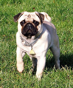 Erscheinungsbild : In Frankreich und Italien auch "Carlin", in den Niederlanden "Dutch Mastiff" in England, USA, Canada, Südamerika, Australien und South Africa "Pug" genannt, stellt der Mops den kleinsten unter den mastinen, brachyzephalen Hunderassen dar. "Multum in Parvo" - ein Maximum an Masse, bei minimaler Größe - lautet sein Schönheitsideal. Der kleine Muskelprotz hat einen harten, vierschrötigen Körper und ein sehr weiches, kurzes Fell. Seine Farben sind beige, apricot und silber mit schwarzer Maske oder einheitlich schwarz. Der Aalstrich am Rücken ist so dunkel, wie möglich, bei gleichzeitiger Reinheit des gelben Körpers. An den Wangen zeigt der Mops einen kleinen schwarzen Schönheitsfleck und an der Stirn sind die Falten schwarz gezeichnet. Der kompakte, kleine Kerl wiegt ca. 6 1/2 bis 8 1/2 kg im Ideal, wobei jedoch square and cobby absolut Vorrang haben. Kleine, puppenhafte Hünd'chen liegen nicht im Sinne des Rassestandards. Es gibt auch Vertreter bis zu 14 kg. Gleichgültig, wie groß oder schwer, der ideale Mops zeigt die Schönheit und Eleganz des Dicken.