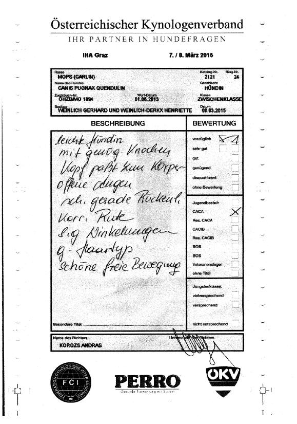 Familie Weinlich gratuliere ich herzlich zu den Ausstellungserfolgen, hier vorzüglich 1, CACA - Anwartschaft auf das Österr. Championat. Eine außerordentlich prachtvolle Hündin, formvollendet nach dem Standard GB und wurd man ihresgleichen an Qualität in der Mopswelt schwer finden. Überdies entspricht Quendulin nicht nur vollkommen dem Standardideal, sie ist auch sportiver, als die meisten anderen Hunde !
