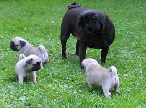 Links sorgt sich die leibliche Mops - Mutter um ihre Kinder; in der Mitte wurden die Kleinen der Obhut der Ur-Urgroßmutter "Baucis" übergeben und rechts hat Rhapsodie ihrem Rudel die Betreuung des Nachwuchses anvertraut, wohlwissend, daß die Babies sich in den besten Händen befinden
