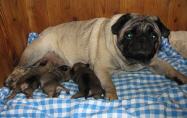 Die Neugeborenen Mops - Kinder mit Rhapsodie. Die Erstlings-Mutter präsentiert bereitwillig die Milchbar. Auch Rhapsodie sorgt sich bereits während und nach Beendigung der Geburt rührend um ihre Babies.