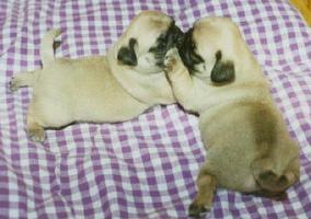 Die beiden Mops - Gnome des C-Wurfes, Caesr und Cilli, im Alter von 3 Wochen