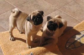 Aganippe sitzt hier links, Alkmene rechts im Bild. Die beiden Mops - Mädchen sind nun 9 Wochen alt