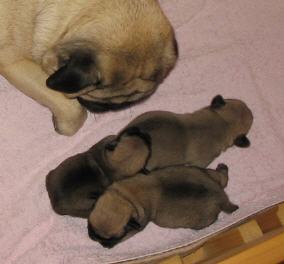 Aus der Ehe zwischen Canis Pugnax Mab und Canis Pugnax Tut Anch Amun wurden am 24.07.2007 4 prachtvolle Buben geboren. Auch bei dieser Geburt erfolgte die Austreibung der Babies sehr leicht und mit wenigen Wehen.