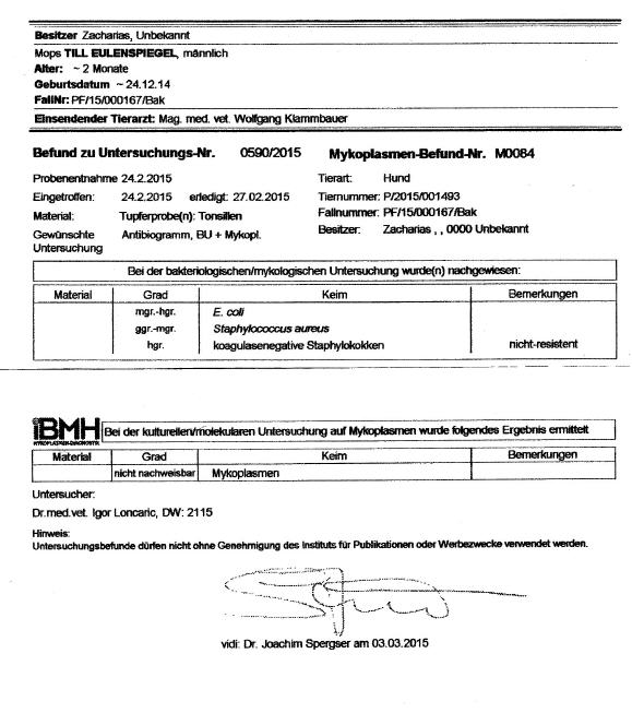 Im unteren Teil des bakteriologischen Prüfberichtes der Universitätsklinik Wien ist ausgewiesen, dass keine pathogenen Tiermykoplasmen vorliegen. Welpen sind das empfindlichste Glied einer Hundefamilie. Hätte nur ein einziger der adulten Tiere des Rudels pathogene Mykoplasmen, hätten es alle Welpen ausnahmslos. Solche bakteriologischen Untersuchungen dienen daher auch gleichzeitig der Bestandskontrolle einer Hundezucht, in der die Tiere miteinander leben.