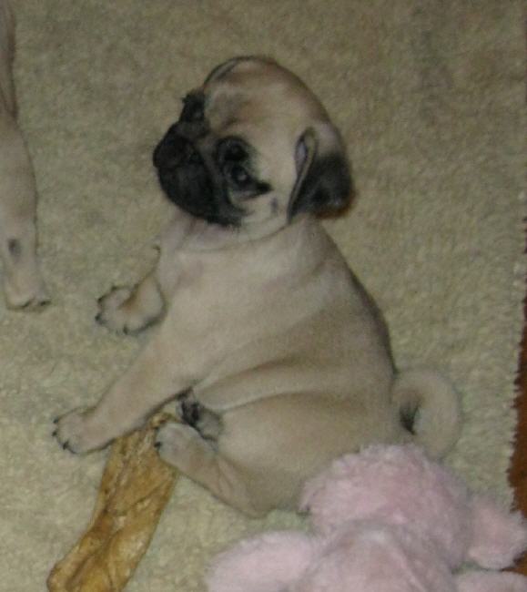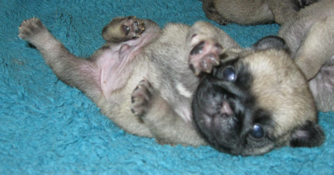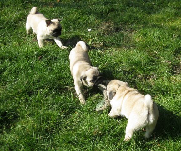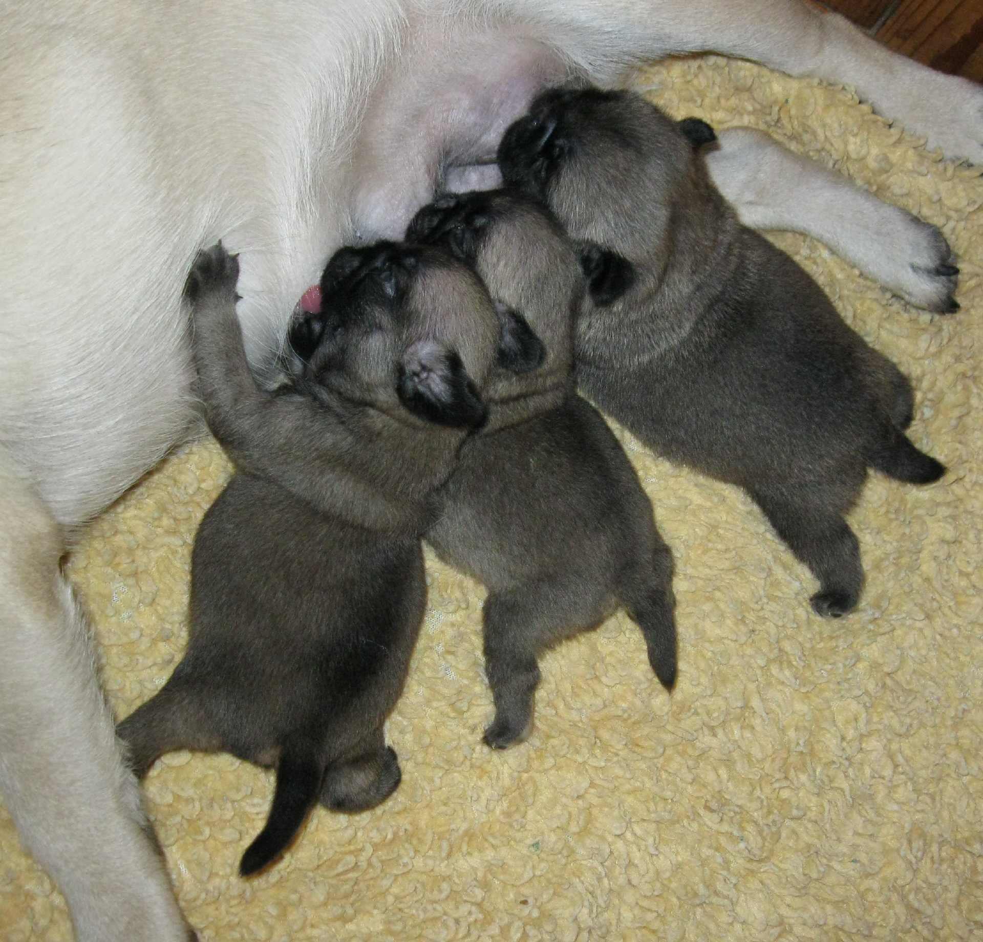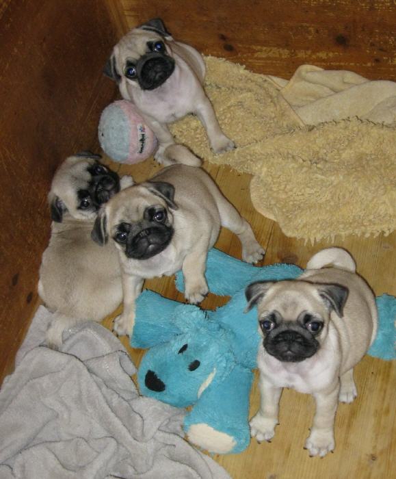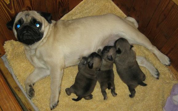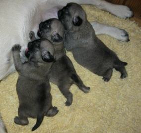 Am 27.12.2014 gebar Canis Pugnax Okke nach Canis Pugnax Quid Pro Quo 1 Buben und 2 Mädchen in einer sehr leichten Geburt. Die Mopsbabies von links nach rechts : Canis Pugnax Tres Jolie, Tequilla Sunrise und Till Eulenspiegel gedeihen ebenso prächtig.