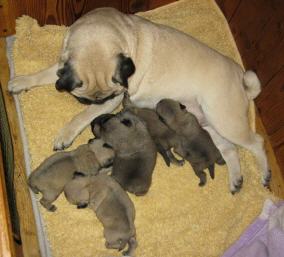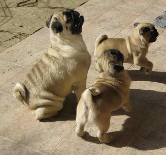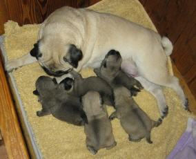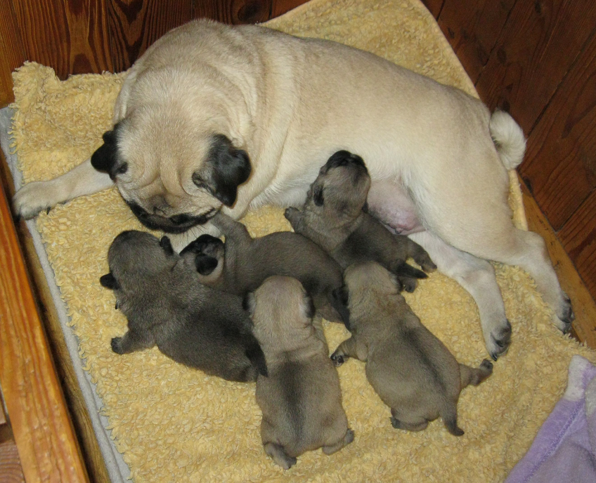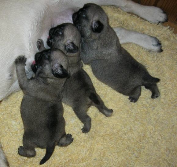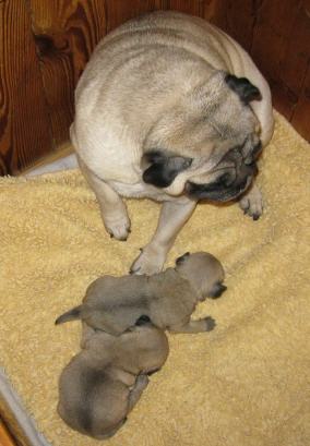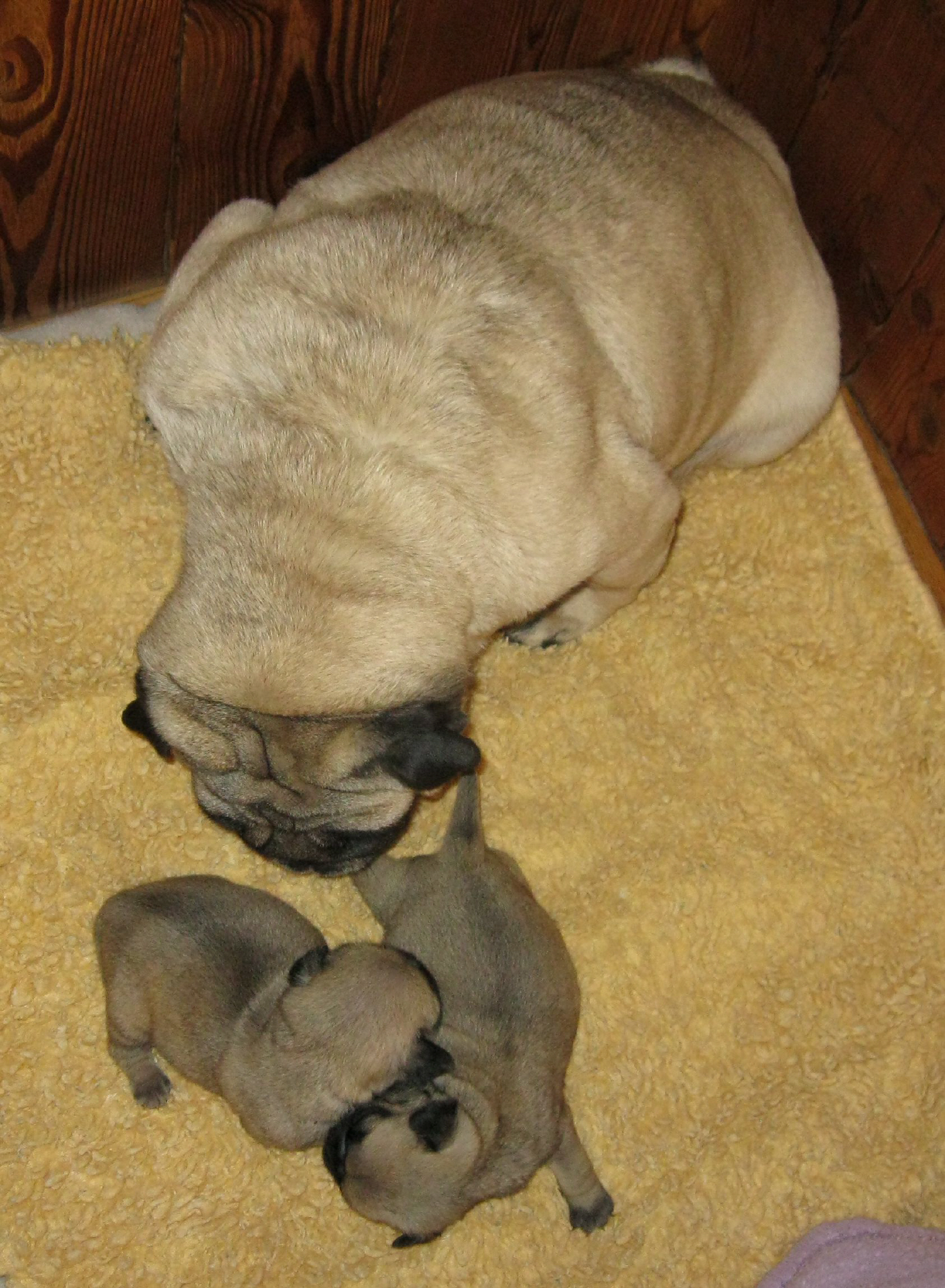 Okke, eine prachtvolle Hündin der österreichsichen Mopszucht. Hier gezeigt mit 2 ihrer äußerst hoffnungsvollen Kindern nach Canis Pugnax Quid Pro Quo. Die Mopsbabies sind die 7. Generation in einer ungebrochenen Linie in Österreich geborener Möpse. Ihre Vorfahren waren die englischen Paramin, eine Mopsfamilie, die mit hohem Alter, die Möpse wurden bis zu 19 Jahre alt, ganz herausragender, sportlicher Schönheit und bester Gesundheit vollkommen überzeugten. Es ist der Stolz einer Zucht, solche Tiere wahren zu dürfen, frei von den Problemen, die der Rasse heute leider allzuoft angelastet werden, bisher vollkommen frei von genetischen Mängel, besonders gute Atmung und damit verbundener Sportlichkeit und Ausdauer, sowie einwandfreiem Exterieur.