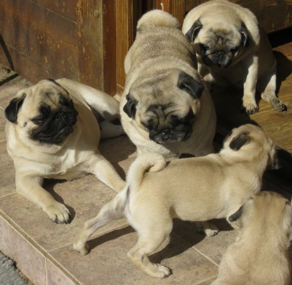 Im Vordergrund links steht Till Eulenspiegel (7 Wochen alt), rechts danaben Schönchen Goldhaar (8 Wochen jung), dahinter rechts ist Tequilla Sunrise (7 Wo) abgebildet und links daneben Tres Jolie (7 Wo). In Hintergrund steht Sindbad. Der Vater : 'Canis Pugnax Quid Pro Quo' ist nicht nur ein hervorragender Vertreter seiner Rasse mit besonderen Qualitäten für Sportlichkeit und absolut geräuschlose Atmung, bisher beste Untersuchungsergebnisse, sondern er vererbt seine erstrebenswerten Eigenschaften auch im gesamten Umfang an jeden einzelnen seiner Nachkommen, wie diese beiden ersten Würfe nach ihm bereits bestätigen. Es scheint, als hätte sich die jahrzehnte lange Arbeit an dieser alten englischen Linie für die Rasse in Österreich gelohnt. Mit dieser neuen Generation kann der Mops seine Bewährungsprobe vor dem Gesetz mit ruhigem Gewissen und standfest entgegensehen.