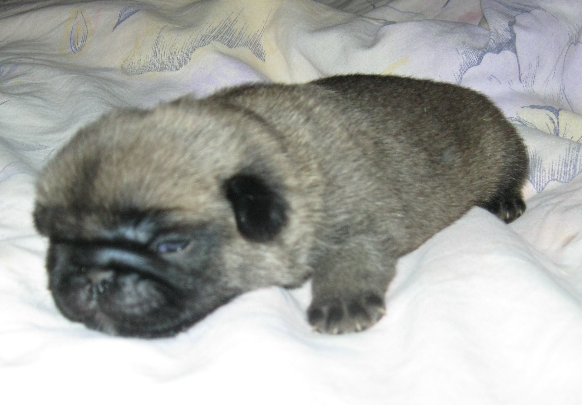 Beige Mopskinder kommen in Antracitgrau auf die Welt und werden wöchentlich heller. Hier kann man diese farbliche Entwicklung sehr gut erkennen. Möpse sind besondere Kontakt-Hunde mit hohem sozialen Empfinden. Sie lieben die Harmonie in der Gemeinschaft als klassische Hunde der Gesellschaft.