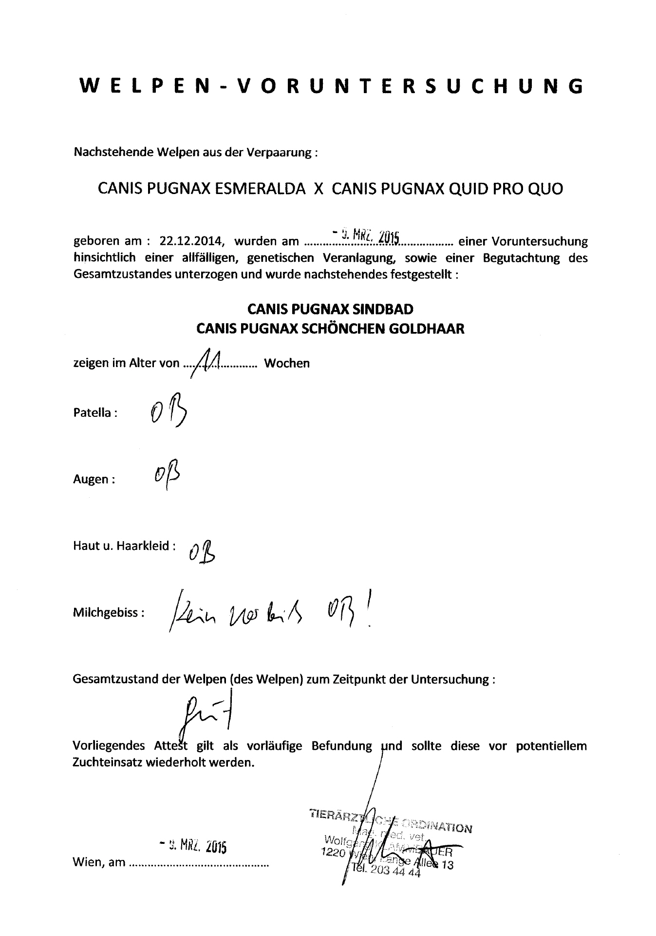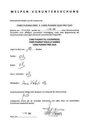 Der Jungrüde - Untersuchungen , Beschreibung des jungen Zuchtrüden - CANIS PUGNAX QUID PRO QUO deckte am 27.10.2014 die Junghündin - ebenfalls frei von den mopsspezifischen Erkrankungen - siehe hier - CANIS PUGNAX OKKE und werden die Welpen Ende Dezember erwartet.
